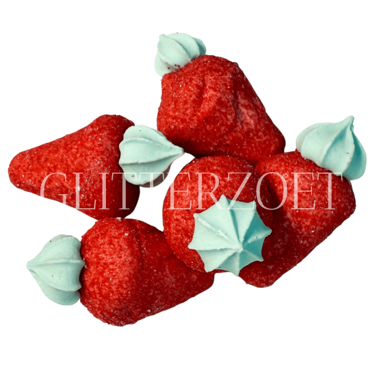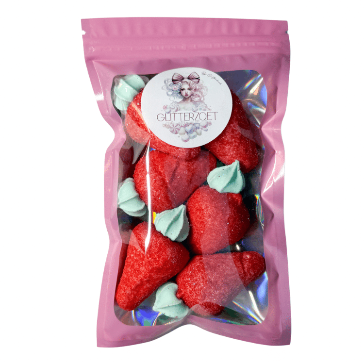 100 gram aardbei merengue spekken met een merenque toef. verpakt in hersluitbare zak