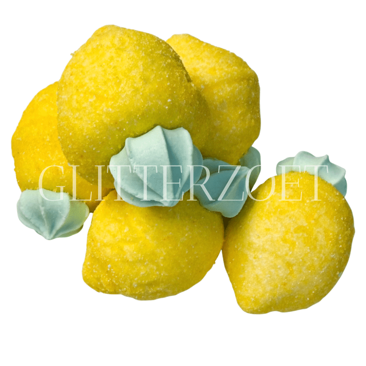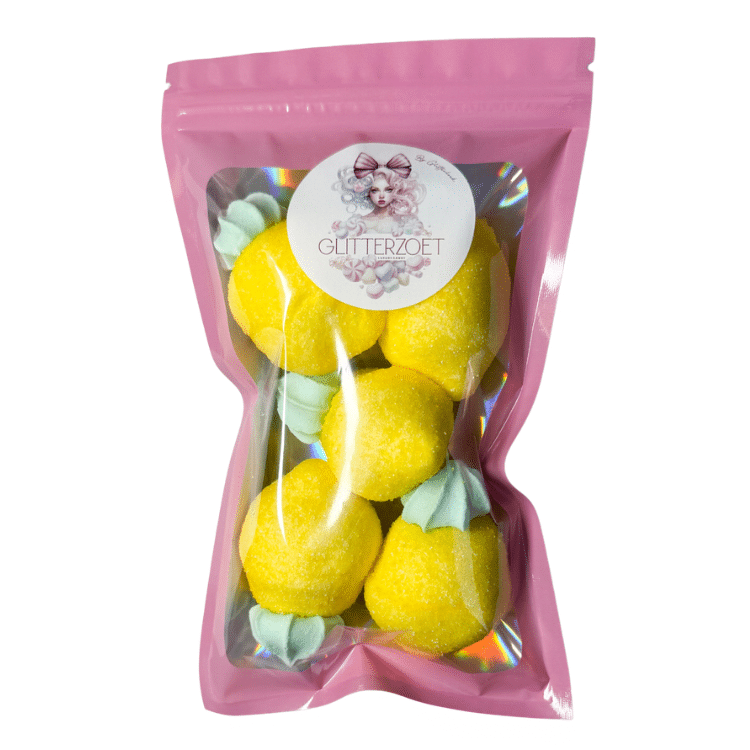 100 gram aardbei spekken met een merenque toef. verpakt in hersluitbare zak