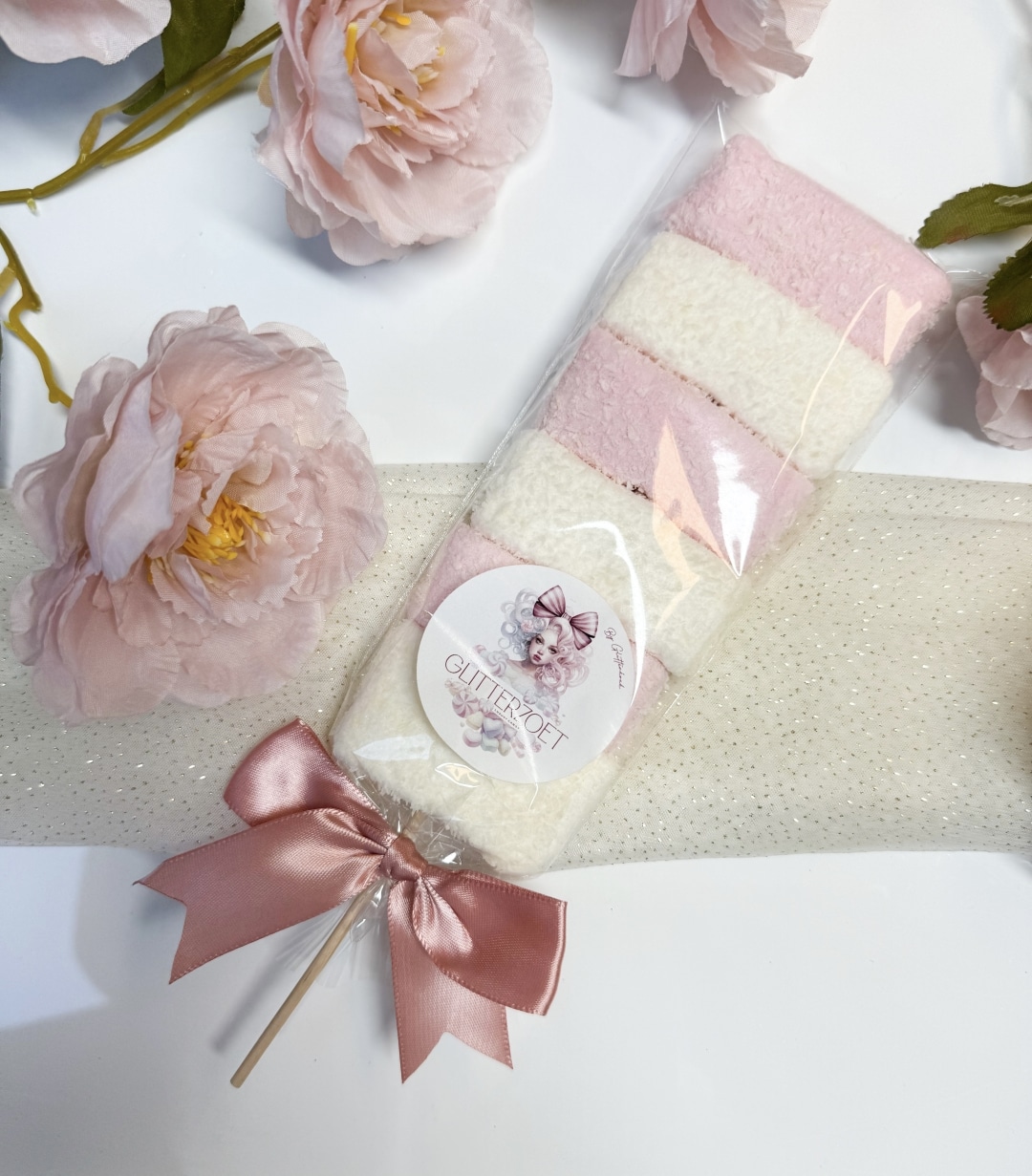 Kokos spek lollystok met strik verpakt. ook leuk voor babyshower bedankjes.