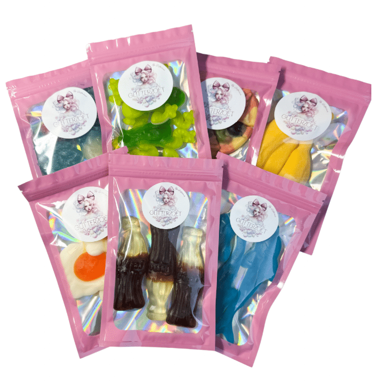 alle kies en mix items worden zo vol als mogelijk met snoep of snoepspek worden verpakt.