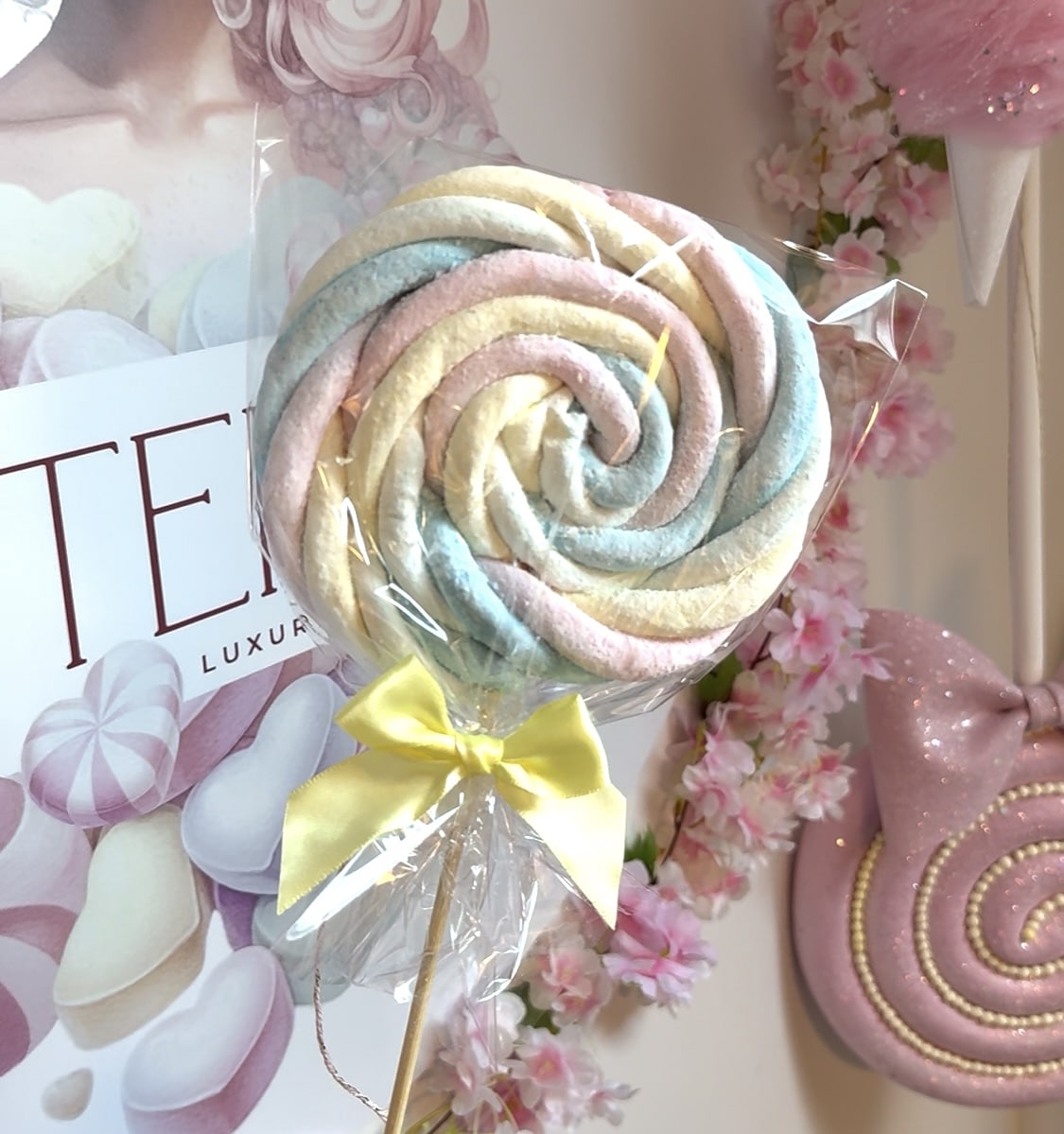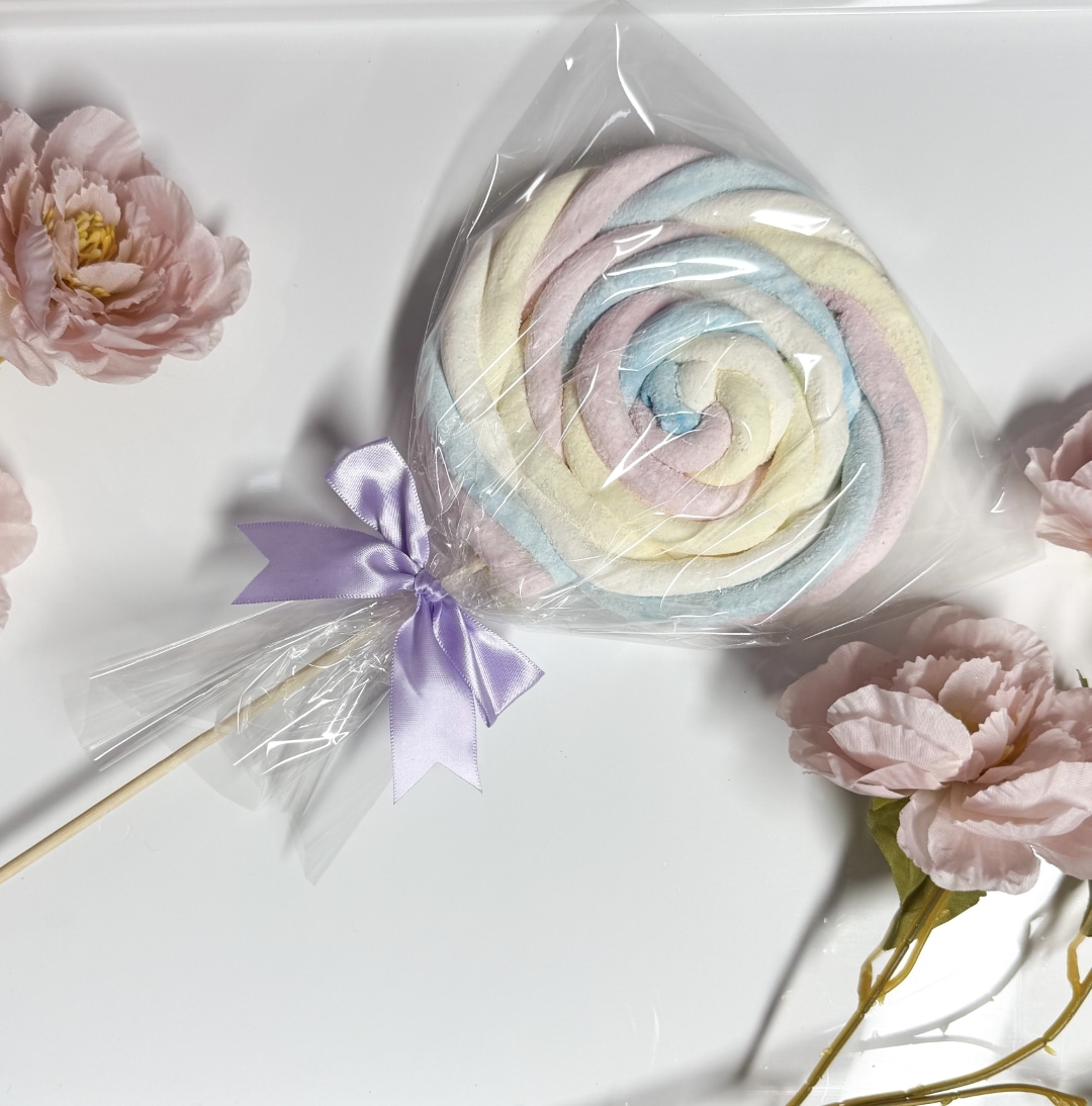 Speklolly XXL 75cm lange spek op een lollystok. verpakt met leuke strik. (kleur strik wit-lila-geel)