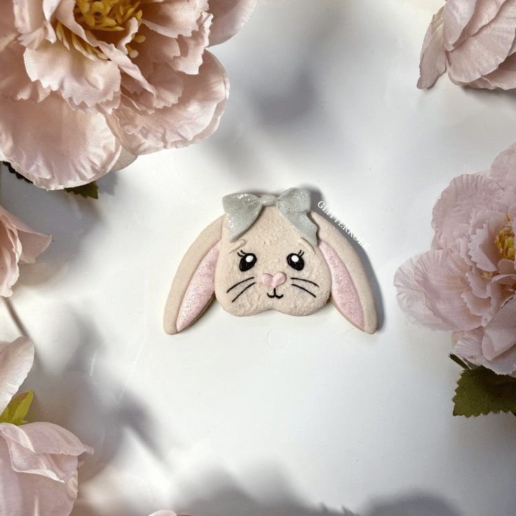hangoorkonijntje met groen glitterstrikje. verpakt met klein koekworteltje.
