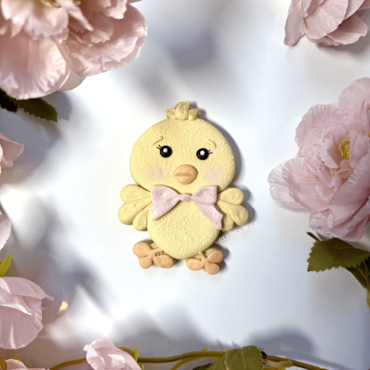 Paaskuiken met roze glitterstrik. geseald met strikjes verpakt.