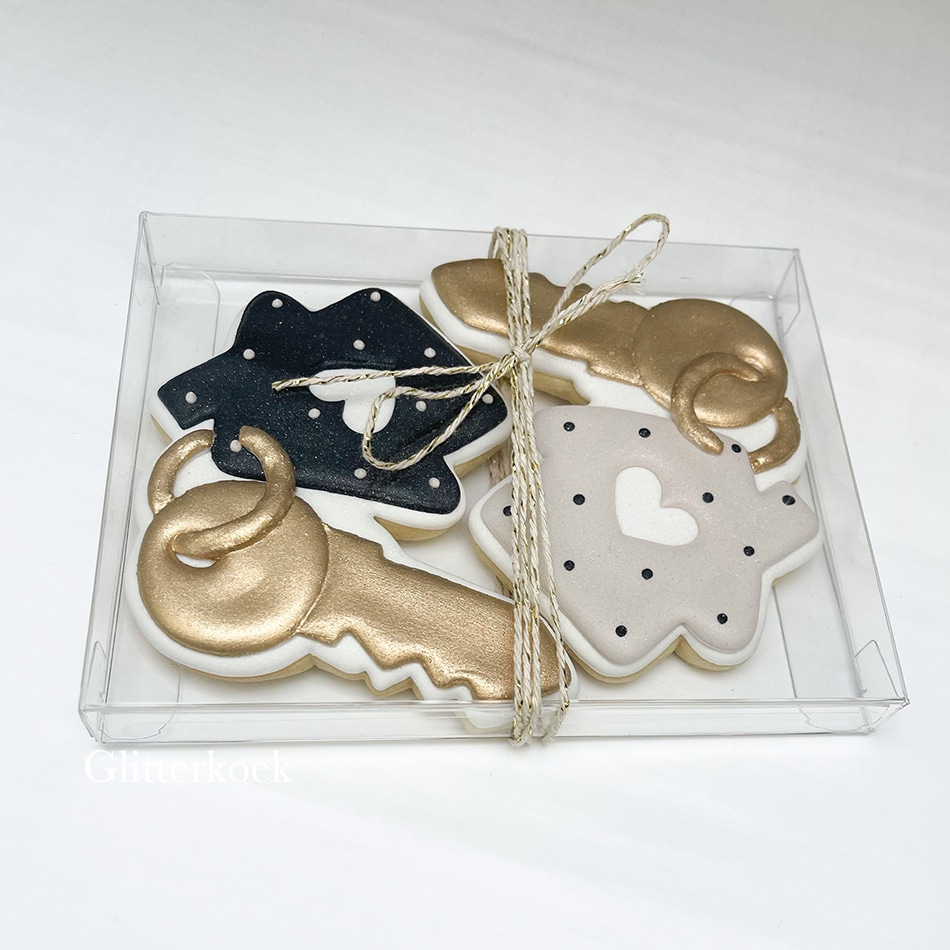 Leuk om cadeau te geven voor een nieuwe woning. Er zitten twee sleutel koeken in een doosje met een touwtje gestrikt. De koeken zijn per stuk 10 cm groot.
